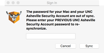 - Change your password on campus while connected to a UNC Asheville wireless or wired (Ethernet) network, then follow the automated prompt from NoMAD to re-synchronize your login keychain.