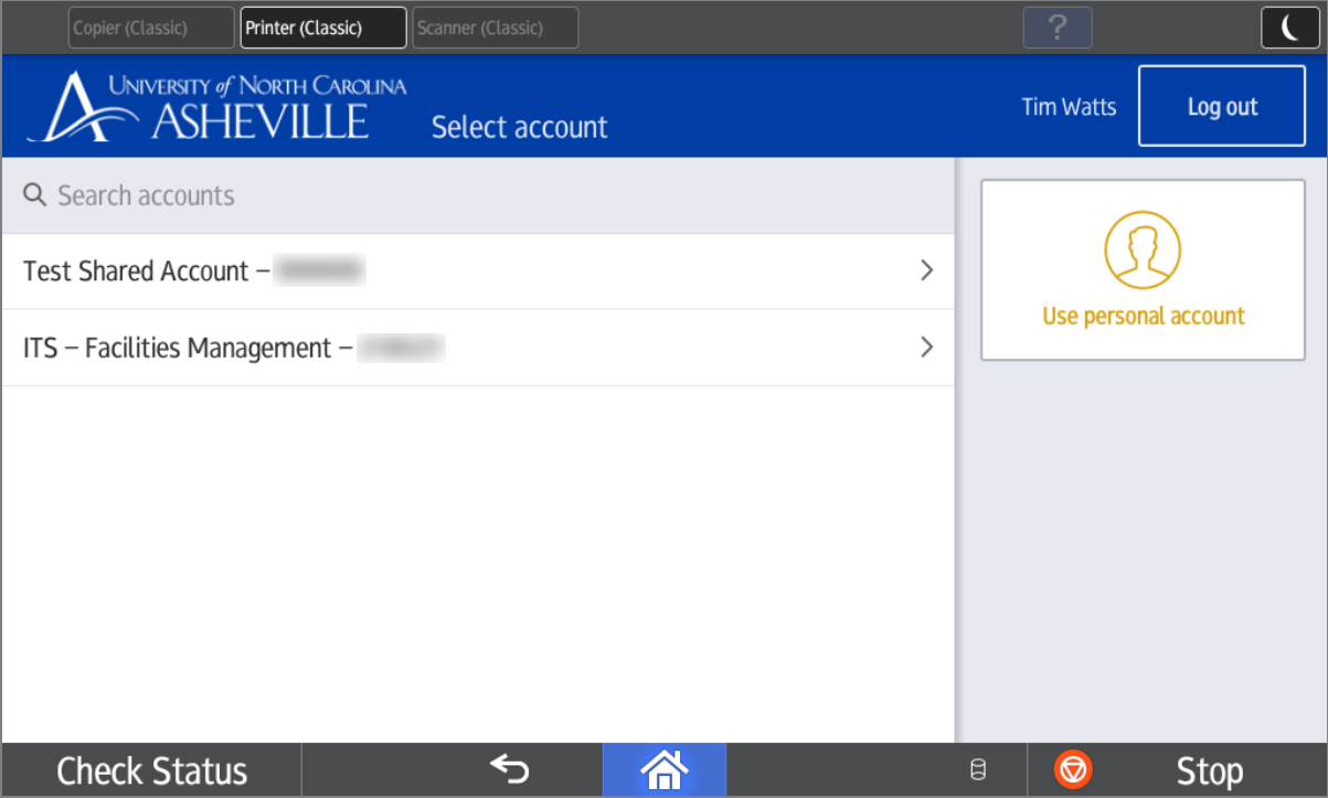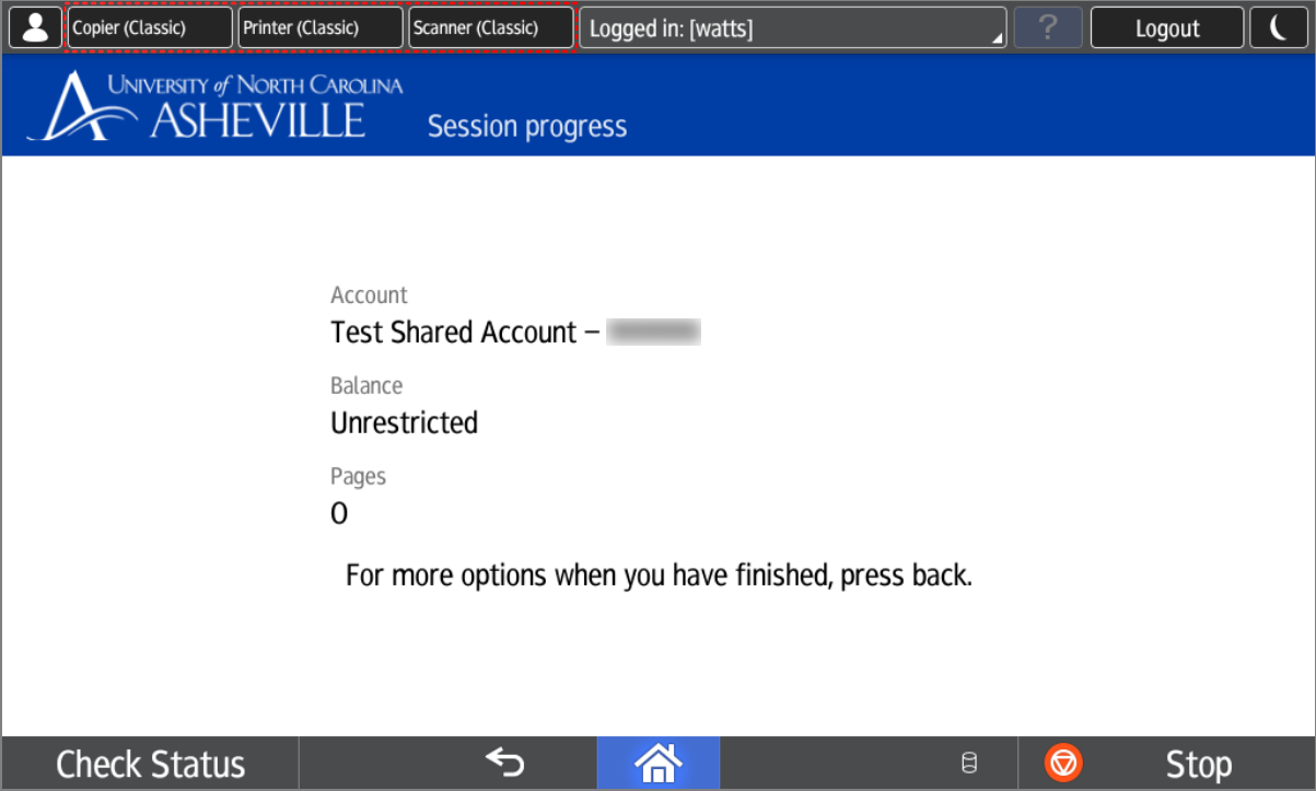 Note: You will be logged in automatically after approximately 5 seconds. - Select the Device Function (Copy / Print / Scan) you would like to use from the top of the screen.