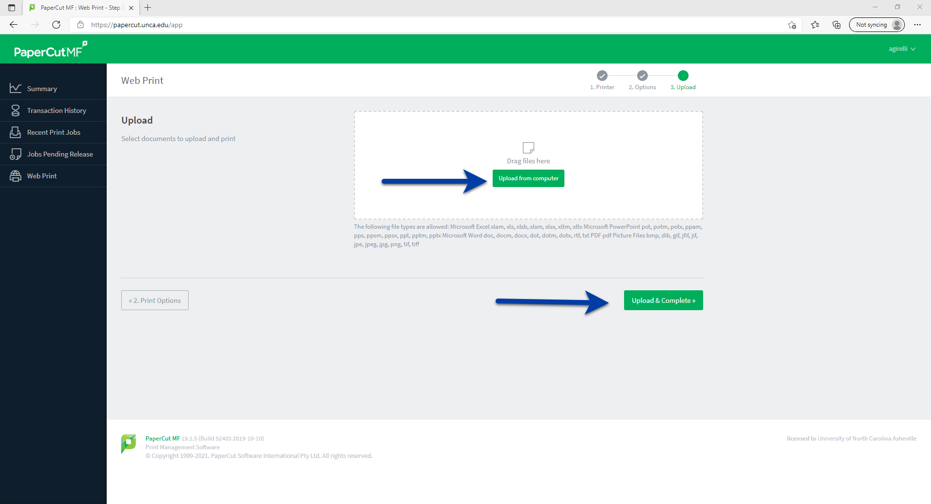 Drag and drop the files to be printed into the file selection area, alternatively you can click "Upload from computer" and use the native Windows file browser.